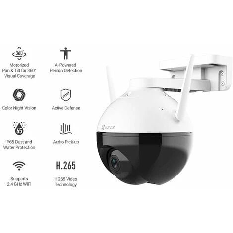 - Cette caméra panoramique et inclinable d’extérieur vous permet de surveiller parfaitement votre environnement. Avec une rotation horizontale de 352° et une rotation verticale de 95°, la caméra C8C offre une vue panoramique de tout ce qui vous entoure. Et l’application EZVIZ vous permet d’y accéder directement sur votre smartphone ou votre appareil mobile.
