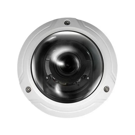 Caméra dôme avec structure en métal de couleur blanche, peut être installée à l’intérieur ou à l’extérieur (étanche IP67) avec un illuminateur infrarouge avec une gamme REAL allant jusqu’à 30M de vision nocturne. La forme en dôme rend le produit installable au plafond ou au mur.